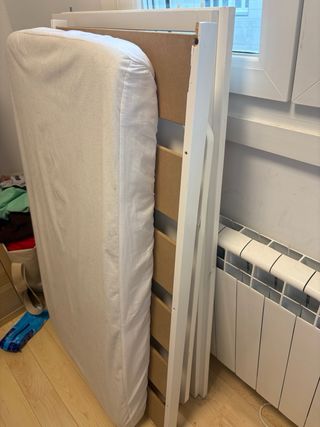 Colchón para cuna de bebé. - Color blanco. - Funda con cremallera. - Protector de colchón y sábanas bajera de invierno. -Lo usamos 3 veces para la cuna de viaje.