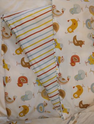 Conjunto ropa de cuna para bebé de 120x60 cm. Incluye: - 1 Edredón de la marca Cooldreams (funda y relleno). 15€. - 1 sábana a juego. 2'5€ - 1 bajera blanca. 2'5€ - 1 relleno de cojín.