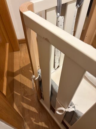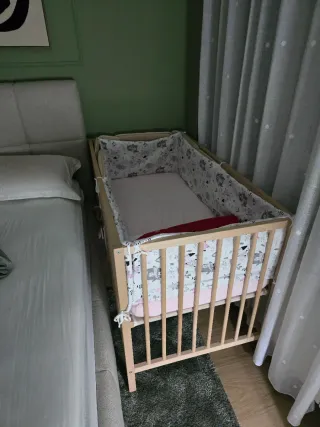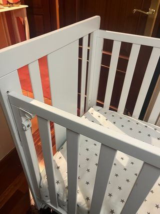 Minicuna de colecho con estructura de madera en color blanco. Se adapta a la cama para mayor comodidad. - Diseño moderno y funcional. - Material de madera resistente. 🍼 Minicuna colecho blanca – como nueva Minicuna colecho en perfectísimo estado, muy poco uso. Ideal para tener al bebé cerca durante las noches de forma cómoda y segura. ✔️ Color blanco, diseño neutro que encaja en cualquier dormitorio ✔️ Altura regulable para adaptarse a la cama ✔️ Laterales resistentes y bien ventilados ✔️ Muy estable y fácil de mover ✔️ Siempre usada con funda protectora ✔️ Hogar sin humo y sin mascotas Se entrega en caja original