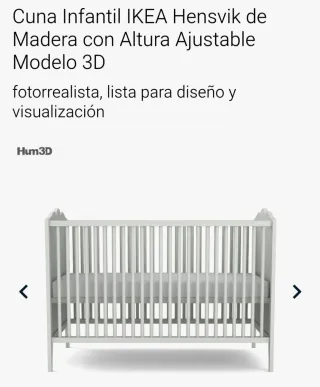 Cuna infantil modelo Hensvik de IKEA, fabricada en madera y con altura ajustable. - Diseño fotorrealista. - Lista para diseño y visualización. Medidas 1240 x 650 x 800mm aproximado Se entrega colchón, funda y sábana sin usar apenas