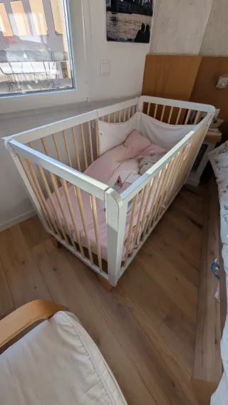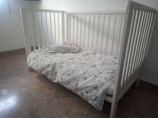 Cuna de la marca IKEA en color blanco. Incluye todas las piezas y tornillos para montar completamente en modo cuna o en modo cama. Esta en muy muy buen estado, tanto cuna como todo lo que se entrega con ella. Precio incluye - Cuna de madera. - Colchón + almohada ikea (nunca nunca se a meado o bomitado) esta perfecto. - Barrera de protección en madera e impresión 3d, fácil de poner y sacar. - Protector en esquina acolchado. - 2x Protector colchón - Nórdico. - 4x Sábana bajera - 3x juegos de Funda nórdicas ikea NO SE ENVIA
