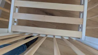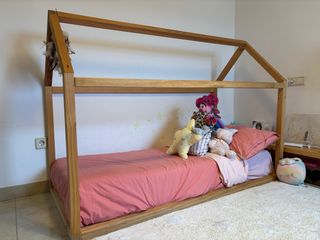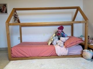 Cama de estilo Montessori fabricada en madera. 80cm X 140cm X 160cm alto( el tejado de la casita) medidas aprox Se entrega con el colchón, 2 protectores, 2 sábanas bajeras, 1 edredón y sus 2 fundas con estampados infantiles. Tiene signos de uso pero le queda.mucha vida. Los protectores de la pared no se dan. Está desmontada excepto la base de lamas.