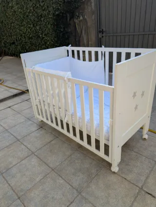 Cuna de bebé en color blanco, ideal para habitaciones infantiles. Su diseño clásico se adapta a cualquier estilo. - Estructura de madera. - Barreras de seguridad. - 2 posiciones de altura. - se puede quitar la barra lateral. - con sumier incluido y colchon. - barra protectora de madera, para cuando se le quita una barrera para que sea cama. La cuna esta en muy buen estado, tiene algunos rasguños en los bordes de la parte de arriba xo por lo demas esta perfecta. Solo la ha usado un bebe. El colchon esta un poco manchado. Con todas sus partes, tornillos y instrucciones guardadas. Tengo la funda protectora del colchon tambien de regal