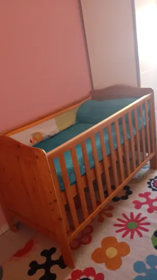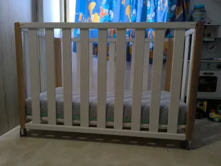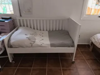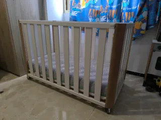 Cuna de madera para bebé, incluye colchón con funda lavable como nueva y sábana bajera nueva que nunca hemos usado. Es una cuna adaptable que puede servir de 0 a 3 años. Las ruedas se bloquean y desbloquean fácilmente, y permiten de mover la cama sin esfuerzo. La cuna es ligera y se monta en 15 minutos. Está ya desmontado y lista para su siguiente bebé :) - Material: Madera. - colchón para bebé con funda lavable a 60, 140x70. - sabana bajera para bebé aislante y impermeable de algodón ecológico. - 2 posiciones de colchón (media y baja. - 3 palos amovibles en la barrera de un lado.