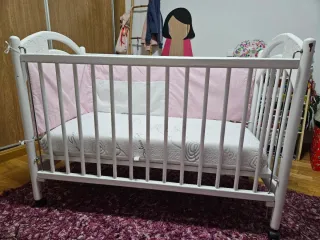 Cuna de madera maciza y duradera con un diseño clásico. Pequeños desperfectos en la pintura. Se incluye colchón en perfectas condiciones, con funda protectora de regalo.