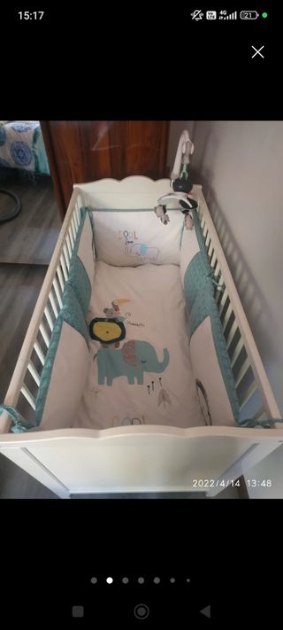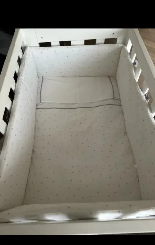 Vendo cuna de madera de Ikea lacada en blanco incluye la estructura (65 cm de ancho; 80 cm de alto y 1,24 cm de largo) funda nórdica y bajera con cremallera como se ve en las fotos, chinconera que recorre toda la cuna, tiene 2 alturas, está en muy buenas condiciones a pesar del uso