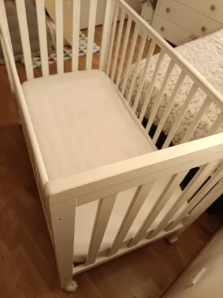 Cuna infantil de diseño moderno y funcional, ideal para crear un dormitorio acogedor. - Color blanco. - Incluye un práctico cajón inferior. - Barreras de seguridad de madera. - Tiradores redondos de madera. A parte de la cuna hay: 2 juegos sábanas invierno 1sabana verano 2sabanas bañeras 1protector colchón 1 funda edredón reversible 1relleno nórdico 1chichoneras a juego 2colcones de cuna Todo 350 negociables Solo cuna 250 Cuna con colchón 260 Tiene un pequeño descorche que cuando esta montada no se ve