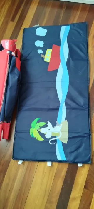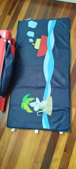Cuna de viaje con un diseño infantil y práctico. - Incluye adaptador de altura. - Estampado de ratón, palmera y barco. Incluye colchón de cuna ( está prácticamente nuevo y con funda)