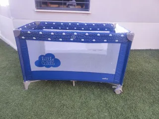 Cuna de viaje plegable, ideal para transportar y usar en cualquier lugar. Se guarda fácilmente en su funda. - Color azul. - Incluye funda de transporte. Está en perfecto estado, sólo tiene manchas en el bolsillo de estar guardada pero todo lo demás está bien