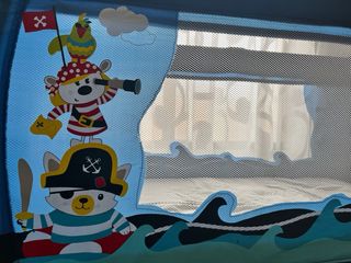 Cuna de viaje Asalvo con un divertido diseño de piratas. - Color azul. - Incluye capota. - Móvil con estrellas. - Regalo colchón con funda lavable. - Ruedas con freno.