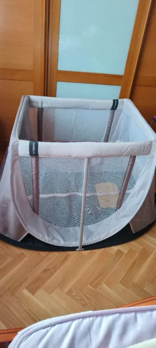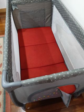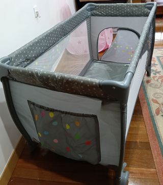 Parque cuna de viaje con colchón incluido. Plegable, tiene funda para guardarlo.