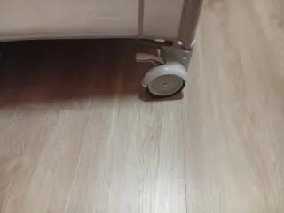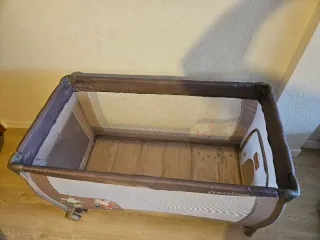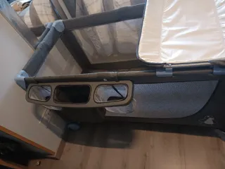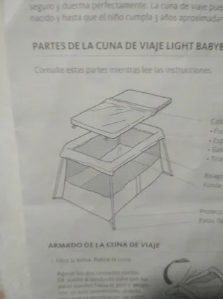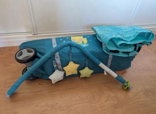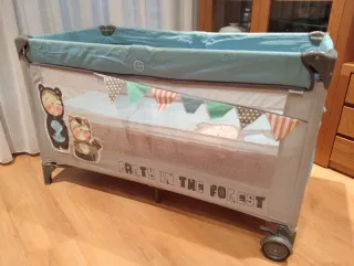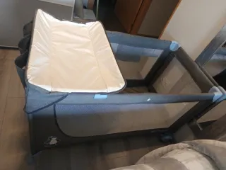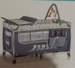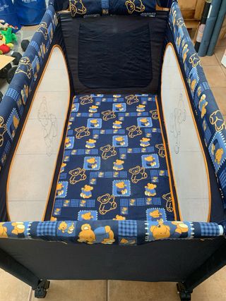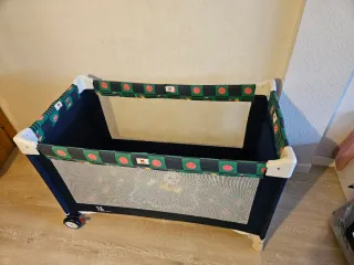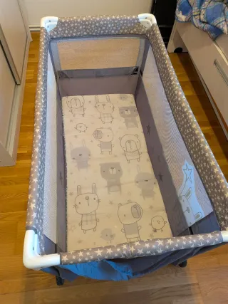 Cuna de viaje que con dos alturas para adaptarse a la edad del bebé, con cambiador y móvil con música y movimiento a cuerda, además tiene función vibración por si al bebé le gusta (yo nunca lo usé porque no le gusta) viene con una colchoneta y la tabla de abajo para dar firmeza que también está acolchada. Vienen las instrucciones impresas en la cuna para siempre acordarte de montar y desmontar aunque es realmente fácil. Con bolsa para el trasporte y se puede llevar rodando lo que la hace más cómoda de llevar. La nueva cuesta unos 150 euros. Tiene una mancha en la funda como se ve en la foto
