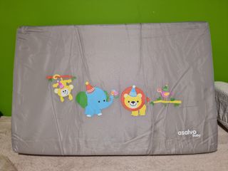 Colchón plegable para cuna de viaje de la marca Asalvo Baby. Presenta un diseño con simpáticos animales. En perfecto estado. Se dobla en 3 para facilitar el transporte. Medida abierto 120x60x5 - Diseño con mono, elefante, león y pájaro. - Colores vivos y alegres. - Material resistente y fácil de limpiar Siempre se ha usado con funda de protector de colchón - Diseño con mono, elefante, león y pájaro. - Tonos grises y coloridos. - Incluye logo de la marca Asalvo Baby.