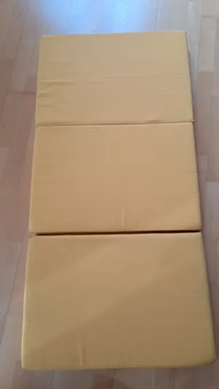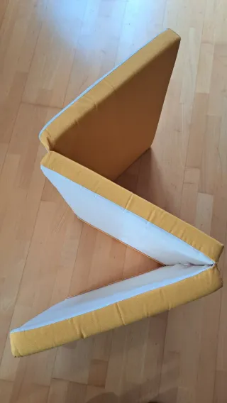 Colchón de cuna de color amarillo, plegable en tres secciones. - Material de espuma. - Funda de tela.