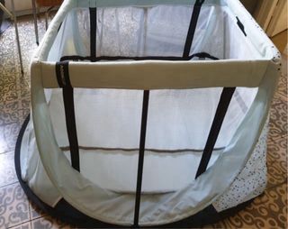 Cuna de viaje para bebé, ideal para viajes o para tener una cama extra en casa. Está en muy buen estado. - Estructura plegable y fácil de montar. - Tejido gris, ligero y transpirable. - Incluye colchón. - Incluye mosquitera ( no usada). Ocupa muy poco y es muy pràctica de Montar( se dobla sin desmontar piezas) y cabe en la bolsita. Usada 2 dias durante un viaje Se plega perfectamente y cabe en su bolsa. Plegable y muy compacto Ventilación lateral Chasis de acero Incluye mosquitera y colchón ( mosquitera no usada y colchon protegido los dos dias con funda protectora (no incluida) Precio real 110€