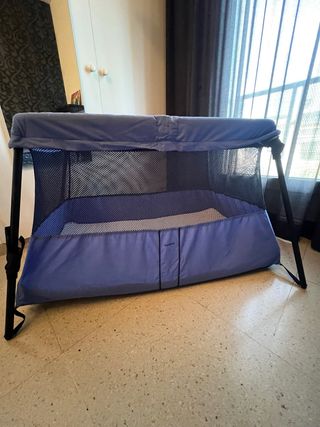 Cuna de viaje plegable de la marca BabyBjörn. Es ligera y fácil de montar. Tiene un pequeño desgaste en el tejido que no afecta el funcionamiento, lo he puesto en la foto. - Color azul. - Laterales de malla transpirable. - Incluye colchón. - incluye funda