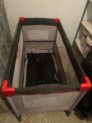Cuna de viaje muy practica y con solo un uso. Practicamente casi a estrenar. Muy facil de montar, en segundos. Con todos los accesorios: funda con cremallera, mosquitera y funda con cremallera para que tanbien sirva como cambiador. Tiene ruedas. Instrucciones originales