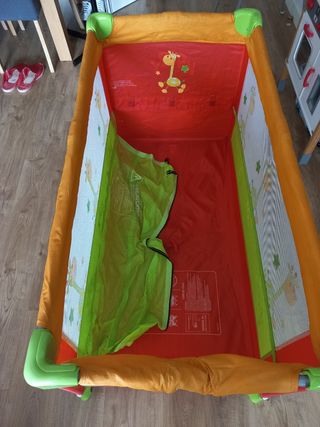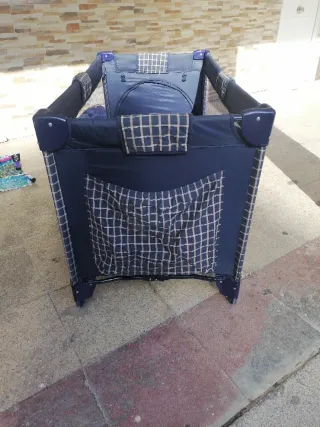 Cuna de viaje para bebé, ideal para viajes o uso diario. Está en buen estado y es fácil de montar y desmontar. Tiene rota una sujeción lateral, que se soluciona con un tubo también incluído. Tiene funda, pero con la cremallera rota. - Incluye colchoneta. - Color azul y rojo. - Bolsillo lateral.