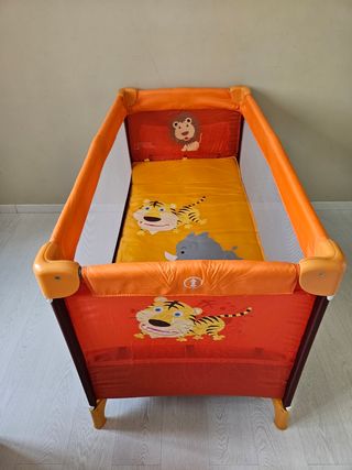 Cuna de viaje con dos niveles de altura, cambiador. Se vende sin colchón por cuestiones de higiene.Tiene su base plegable acolchada. Usada como parque básicamente, la cremallera lateral da mucho juego al peque. Cuidada y limpia, alguna marca de plegarla. El cambiador no se usó. Base elevadora en altura. Manual de instrucciones y funda.