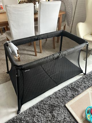 Cuna de viaje Bugaboo de color gris, fácil de plegar y transportar. Opción de colchón a dos alturas: elevado para recien nacido y bajo para más mayores. Incluye colchón, funda para transportarla y manual de instrucciones. Medidas de la cuna abierta y plegada en la última foto. Están impecables tanto la cuna como el colchón. Se recoge en zona calle Arroyo, Sevilla capital.