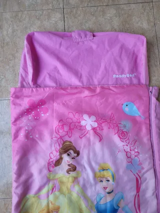 Saco de dormir infantil con las princesas Disney. Reversible. En muy buen estado. Diseño en tonos de fondo rosa por la cara de los personajes de princesas Disney (Cenicienta, Bella y Aurora). Por la otra cara es todo color rosa. Perfecto para viajes o para usar en casa. La propia funda de la almohada hace de bolsa o funda para guardar el saco enrollado. Medidas: 60x120x30.