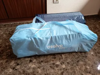 Cuna de viaje plegable de la marca Asalvo baby. Es ligera y fácil de transportar. Medidas 120x60 cm. Incluye colchón enrollable y una funda de colchón impermeable. Se ha usado en pocas ocasiones. - Color azul claro. - Incluye bolsa de transporte.