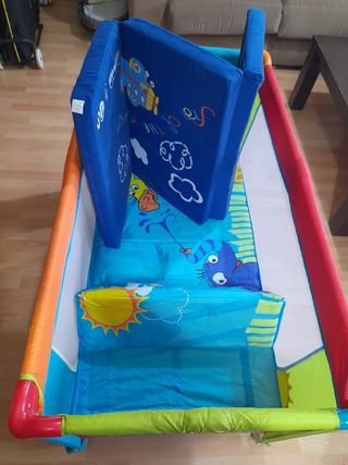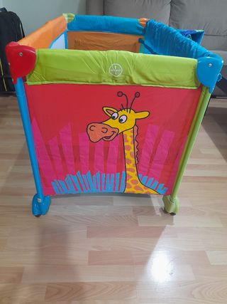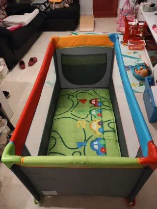Cuna de viaje como nueva con colchoneta y funda tiene salida para cuando el bebé sea más mayor salga. Lateral para dejar cosas.