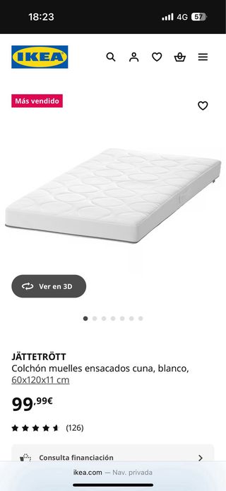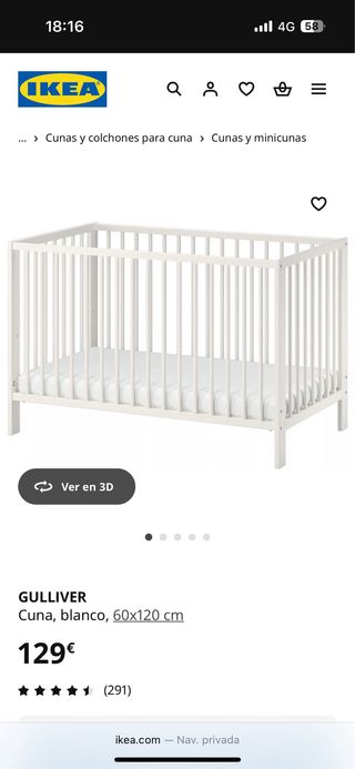 Cuna GULLIVER de IKEA en color blanco y colchón JÄTTETRÖTT. Ideal para habitaciones infantiles. - Medidas: 60x120 cm. - Diseño clásico y funcional. - Posibilidad de quitar un lateral para hacer mini cama. - Desmontada. - Colchón impecable en perfecto estado. - Regalo protector impermeable y transpirable para el colchón. - Par de chichoneras azules con estrellitas para proteger todo el perímetro de la cuna. 95€ Cuna + colchón con funda impermeable y transpirable. 110€ Incluyendo el par de chichoneras.