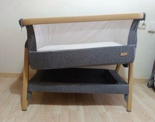 Mini cuna Tutti Bambini, ideal para colecho. Su diseño moderno y funcional se adapta a tus necesidades. - Estructura de madera clara. - Tejido gris. - Incluye funda protectora.