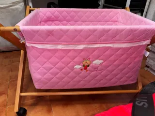 Cuna de bebé en color rosa, con un diseño acolchado y un colchón incluido También viene con otra funda de cuna en color beis. También regalo muchas sábanas de cuna! - Estructura de madera. - Interior acolchado. - Incluye colchón.
