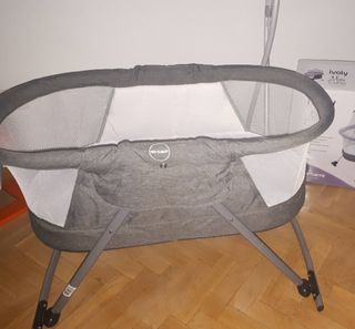 Función co-sleeping con apertura lateral para colecho. 8 alturas Posición antirreflujo anticólicos Función balancín Ruedas pivotantes con freno Fijación a la cama Incluye colchón, y Relleno edredón y funda desenfundable Color beige Preciosa y en perfecto estado