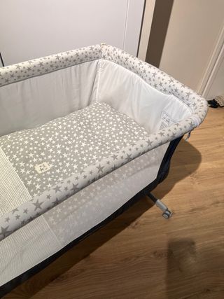 Mini cuna que se puede hacer balancín. Se puede regular en altura. Colchón anti asfixia y anti plagiocefalia recomendada para bebes. Viene con funda también que no sale en las fotos. Regalamos protector lateral azul con estrellitas.