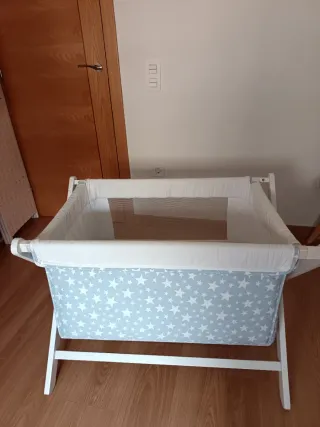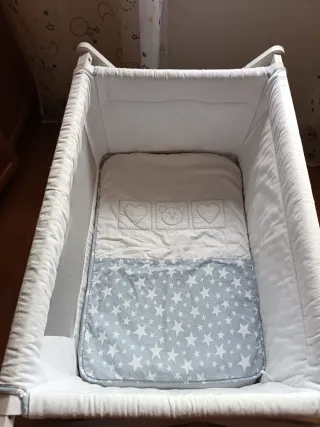 Minicuna en color blanco con un diseño tierno y moderno. - Incluye un colchón con funda. - Ruedas extraibles. - Lateral de malla transpirable (con algún agujerito) - Tiene marcas de desgaste en la pintura. Mejor ver.