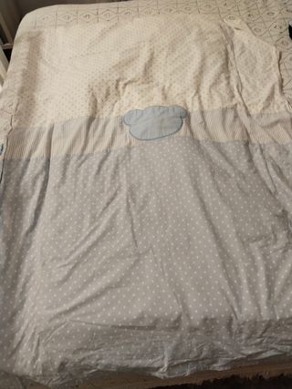 Funda para cuna con un diseño tierno y suave. - Estampado de estrellas en tonos grises y blancos. - Detalle de un osito azul en la parte superior. - Franja central con rayas verticales. Falta coser una esquina una cinta