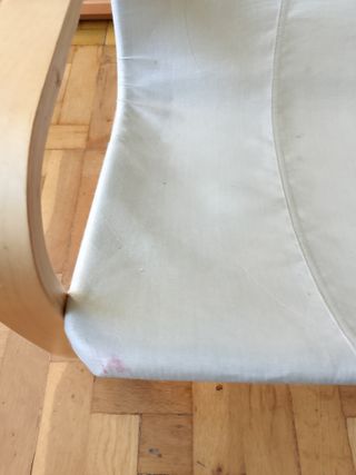 Silla infantil Poang de Ikea. La funda está algo rota por la parte superior (si se quiere cambiar, venden recambios en Ikea) pero se puede usar perfectamente. Marcas del uso, pero le queda mucha vida todavía.