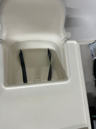 Silla de comer para bebé de Ikea, en color blanco. - Diseño ergonómico. - Arnés de seguridad de 3 puntos. - Una de las correas con un poco de desgaste por el borde pero no impide el correcto amarre. - Se entrega con funda NO ENVIO ENTREGO EN SANTANDER Y ALREDEDORES