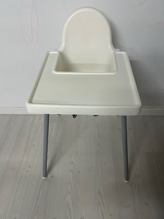 Silla de comer para bebés de la marca Ikea. Su diseño es blanco y las patas son grises. - Bandeja de plástico. - Patas de metal. - Cojin soporte+ funda. Le falta la correa del centro.