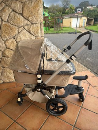 Bogaboo Cameleon 3. Año 2015. Se vende con accesorios originales comprado todo en El Corte Inglés. Precio del patinete para segundo niño original de 105€. Precio de funda de transporte original apta para facturación en aviones de 150€. Tiene algún signo de desgaste en la piel del manillar, pero está en buen estado de conservación.