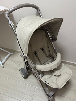 Se vende silla ligera de la marca Bebecar en color beige con el chasis en plateado. Está en buen estado ya que ha sido usada siempre con fundas.