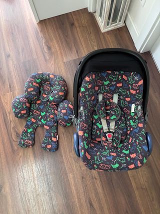 Maxi-Cosi con base para recién nacidos con una divertida funda estampado de dinosaurios en tonos verdes, naranjas y azules sobre fondo oscuro. Incluye reductor de dinosaurios a juego para recién nacido. - Base - Estampado de dinosaurios. - Incluye reductor para recién nacidos.