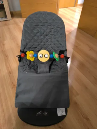 Hamaca babyjörn con funda original y funda de repuesto. También arco de juego con figuras que se puede quitar y poner. Modulable en altura. Se puede usar desde los 3.5kg hasta los 13 kg Caja original