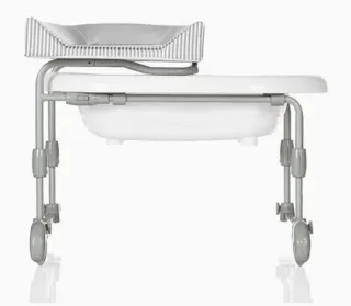 Bañera para bebé diseñada para colocar sobre la bañera familiar. Modelo reversible: opción de colocar la bañera a la izquierda o a la derecha de los grifos del agua. Se puede colocar incluso sobre bañeras con formas irregulares, con un ancho máximo de 90 cm y mínimo de 70 cm. 6 posibilidades de altura con desplazamiento máximo de 11 cm. Peso del producto: 9,5 Kilogramos. Dimensiones del producto: 82 x 72 x 51 cm. Capacidad de la cubeta: 17 litros. Cerrado ocupa sólo 82 cm. Está estropeada la cubierta del cambiador, pero se podría poner una funda para que no se viera
