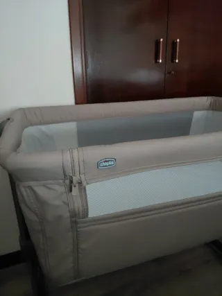 Cuna de colecho Chicco Next 2 Me Essential en color beige. Perfecta para tener al bebé cerca durante la noche. - Diseño moderno y funcional. - Laterales de malla transpirable. - Colchón y funda incluidos. - No incluye la ropa de cama, solo se muestra para que vean que el colchón ha sido protegido con sabanas, mantas y saquitos de dormir y está como nuevo.