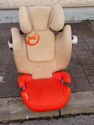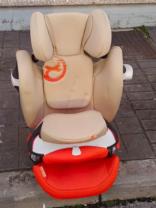 Silla de coche Cybex Pallas S-Fix en color beige y naranja. Diseñada para niños de 9 a 36 kg. Muy buena calidad, va creciendo con el bebé para que no tengas que comprar nada más hasta que pueda ir solo con el cinturón. - Isofix. - Sistema de fijación S-Fix. - Reposacabezas ajustable. Las marcas son porque ha estado almacenada unos meses, pero es de esperar que recuperen la forma original. Siempre se ha usado con funda, la tapicería está en perfecto estado. Incluye instrucciones.