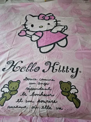 Funda nórdica y sábana bajera con diseño de Hello Kitty. - Incluye funda nórdica y sábana bajera. - Estampado de Hello Kitty con ositos y texto. - Diseño en tonos rosas y blancos.