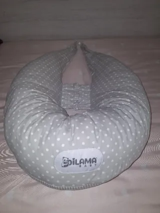 Cojín de lactancia y embarazo de la marca Dilama Baby. Su diseño ergonómico ofrece soporte y comodidad. - Color gris con estampado de lunares blancos. - Funda de algodón 100% extraíble y lavable. - Material de relleno: Espuma viscoelástica, Fiber Balls - Forma Semicircular