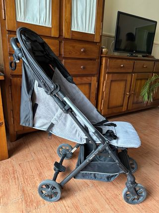 Silleta de paseo Moon en perfecto estado. Ideal para paseos cómodos y seguros. - Diseño ligero y plegable para facilitar el transporte y almacenamiento. - Tapicería beige en buen estado. - Incluye capota para proteger del sol y plástico para la lluvia. Se regala funda y sombrilla a juego. Tiene la funda del agarre deteriorada y le faltan los anclajes de los tirantes.