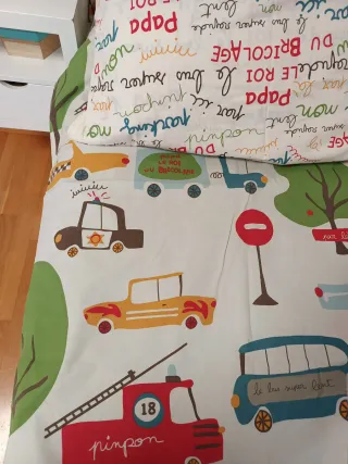 Funda nórdica infantil con un divertido diseño de coches, camiones y texto. Incluye: funda, almohadón, y 2 fundas de cojín grandes. Medida: cama de 90 o 1,05cm - Estampado de vehículos variados como coches, camiones y autobuses. - Incluye texto decorativo en diferentes idiomas y tipografías. - Ideal para dar un toque alegre a la habitación.