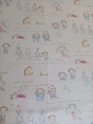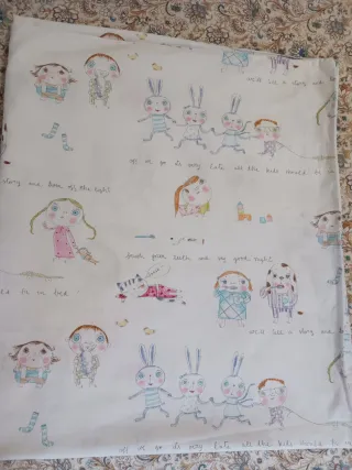 Funda nórdica para cuna con un divertido estampado de conejitos y niños jugando. Ideal para la habitación infantil. - Diseño colorido y tierno. - Estampado de animales y personajes. - Apto para cuna.