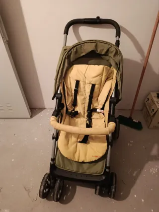 Silla de paseo ligera y práctica para bebés. - Color verde y amarillo. - Arnés de seguridad. - Barra frontal. - Ruedas dobles. - Fundas a juego